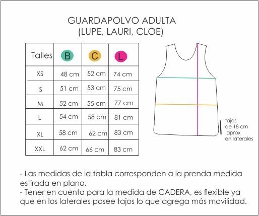 Algunos guardapolvos pueden tener recortes en broderie de algodón o gabardina de algodón. Estas telas no poseen características antimanchas.